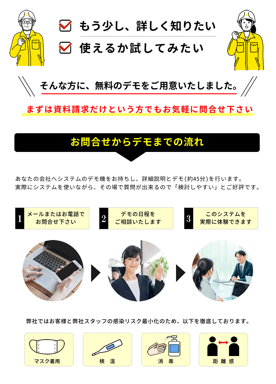 工事システムを安心して、お使いいただきたいという思いで、6年間無償のサポートを行っております。操作につまづいた時の電話質問やパソコンなどの突然のトラブル対応、修理、点検も6年間無償で行っております。操作の質問も気軽に出来ますので安心です。