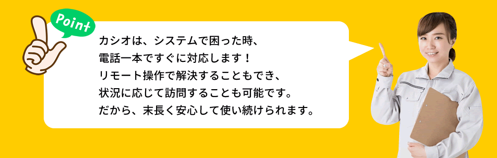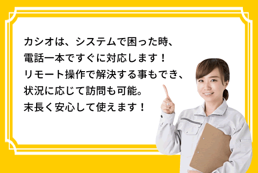 お客様が安心してカシオのシステムを使い続けられるように誠心誠意サポートを行っております。