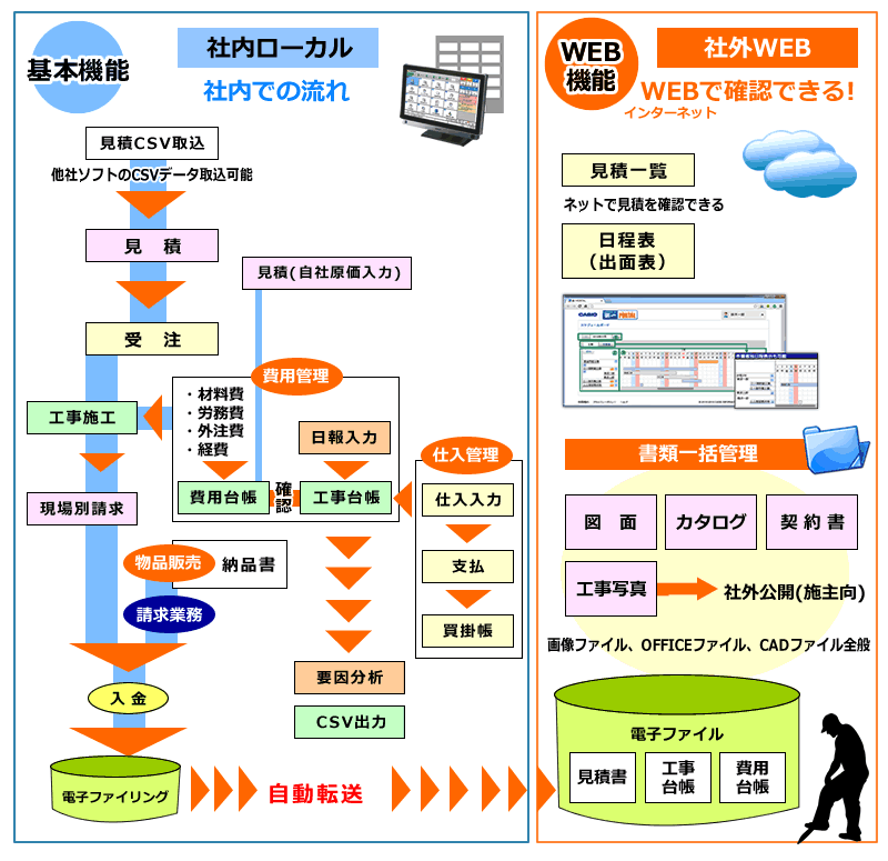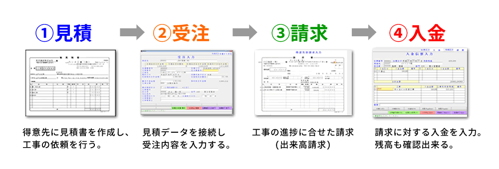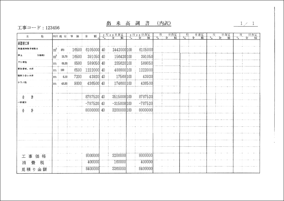 カシオ工事管理システムは、出来高請求に対応したシステムです。工事出来高(実際に出来た部分)に応じて、得意先へ請求する明細を作成できます。受注済みの工事に対し、見積の情報を契約情報として取込み、取込んだ契約情報に対する出来高を入力し、出来高明細書を作成することができます。※取込んだ契約情報は変更することもできます。