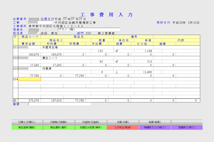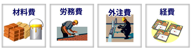 工事ごとに発生した費用を、費用種類別に入力することが出来ます。工事費用の種類は、