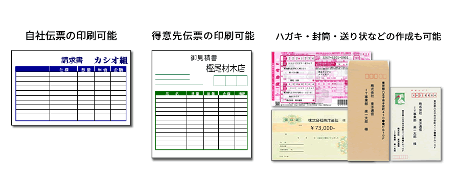 カシオ工事管理システムは、自社伝票や得意先指定伝票も作成(印刷)することが出来ます。今お使いの伝票は全て、そのままご利用いただけますので、手書きの伝票も全て印字化できます。ハガキ、ヤマトなどの各運送会社の送り状全て、領収書、封筒(A3までOK)など、様々な書類や伝票を印刷することが出来ます。今まで手書きで時間が掛かっていた伝票作成も、印字化することで作業時間の短縮に繋がります。