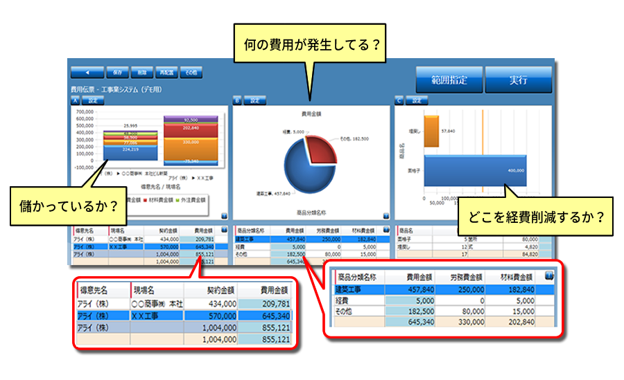 カシオ工事管理システムは、工事費用や工事粗利を分析し、グラフや表で、すぐに確認することができます。一目で「この工事は今、儲かっているのか?無駄な費用が発生していないか?」という状況を把握できます。この情報をいち早くキャッチすることで、最終的に赤字工事にならないように事前に対策を打つことができます。